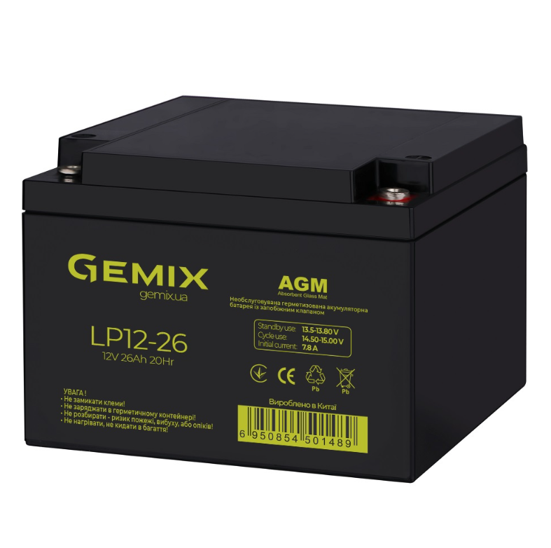 Аккумулятор GEMIX модели LP12-26 создан для обеспечения стабильного энергоснабжения. Номинальное напряжение составляет 12 В , а ёмкость — 26 А·ч, что делает его оптимальным решением для бытового и профессионального использования.