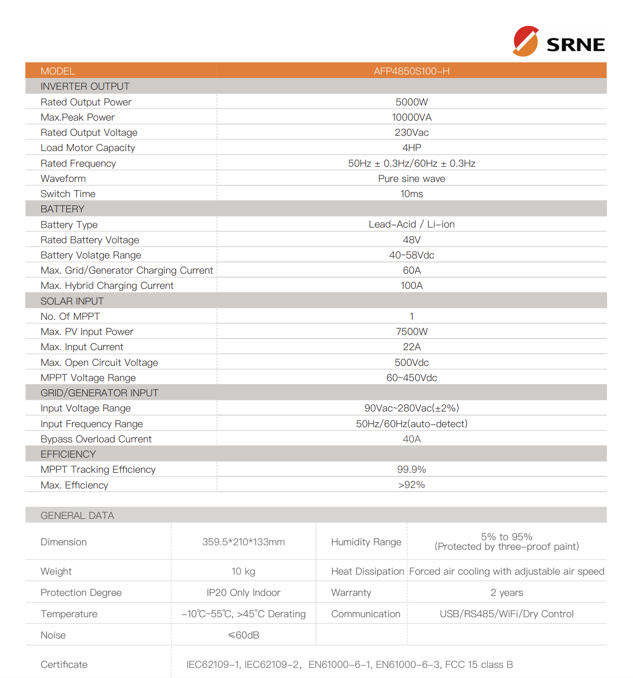 Гибридный инвертор SRNE AFP4850S100-H (5 КВт 48В)