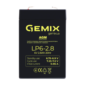 Акумулятор GEMIX моделі LP6-2.8 створений для забезпечення стабільного енергопостачання. Номінальна напруга складає 6 В , а ємність — 2.8 А·год, що робить його оптимальним вибором для побутового та професійного використання.